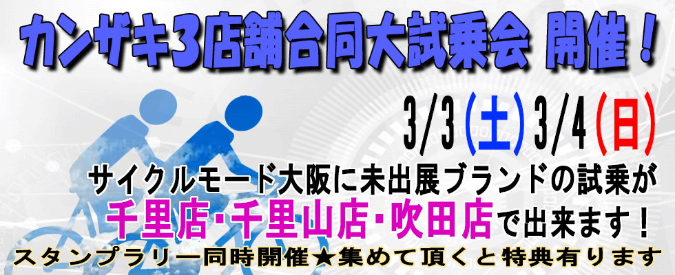 カンザキ千里店、阪急千里山店、吹田店の3店舗で、サイクルモードライド大阪に出展していないブランドを中心に大試乗会を開催!