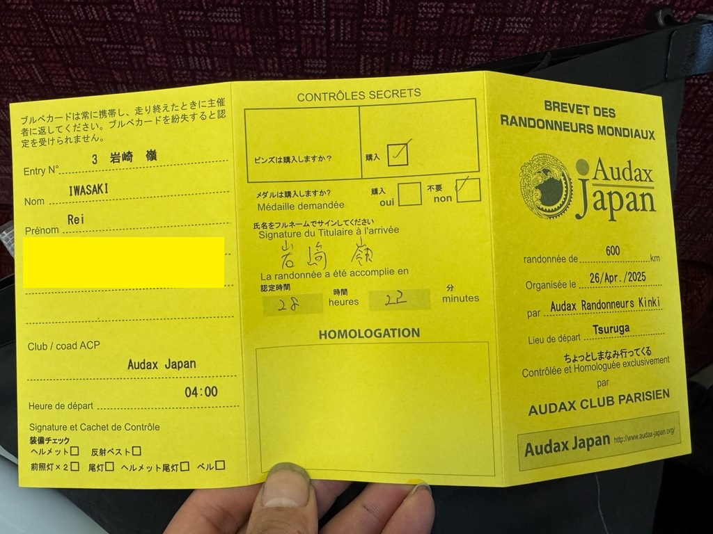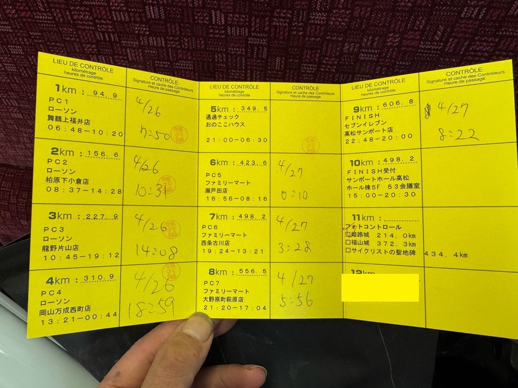 ブルベカードはこんな感じで。仮眠をとってないのでひたすら駆け抜けた感じです。フィニッシュ受付は時間の都合で出来なかったので、写真の送付とブルベカードの送付で対応いただきました。