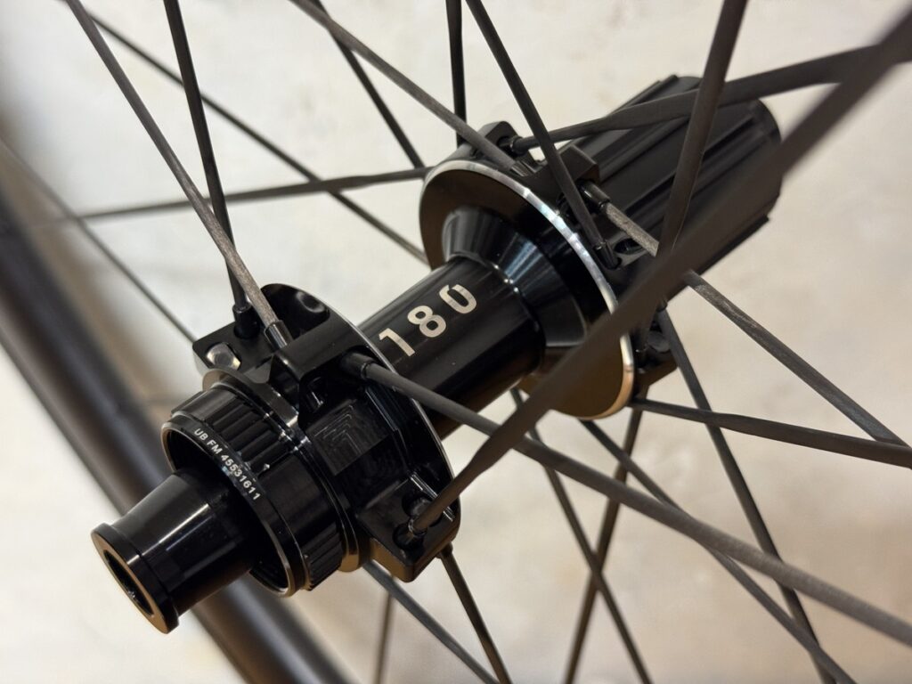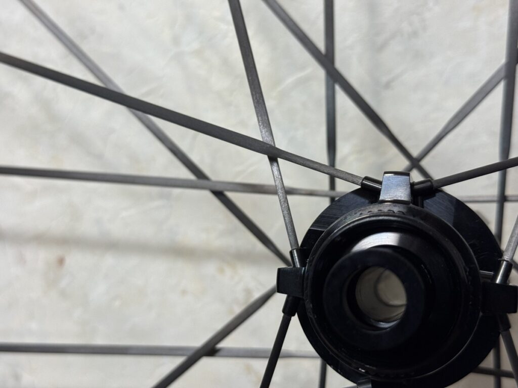 カーボンスポークはVONOA製。フロントが18本、リヤが24本とイマドキの本数。個人的にハブの通し方が引っかけじゃないのが好印象。