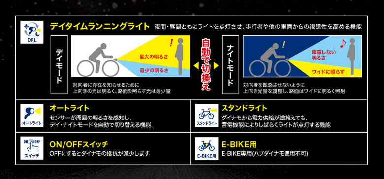 ママチャリにもついていますが、ハブダイナモのライトは大体オートライト機能がついてます。
