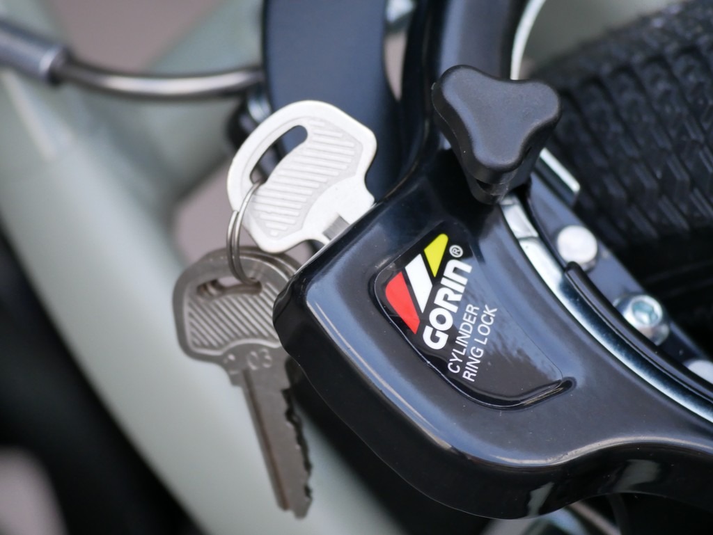 リング錠の専用ホルダーにヘルメットを掛けてリング錠を施錠するだけの簡単操作ピンシリンダー機構を採用。