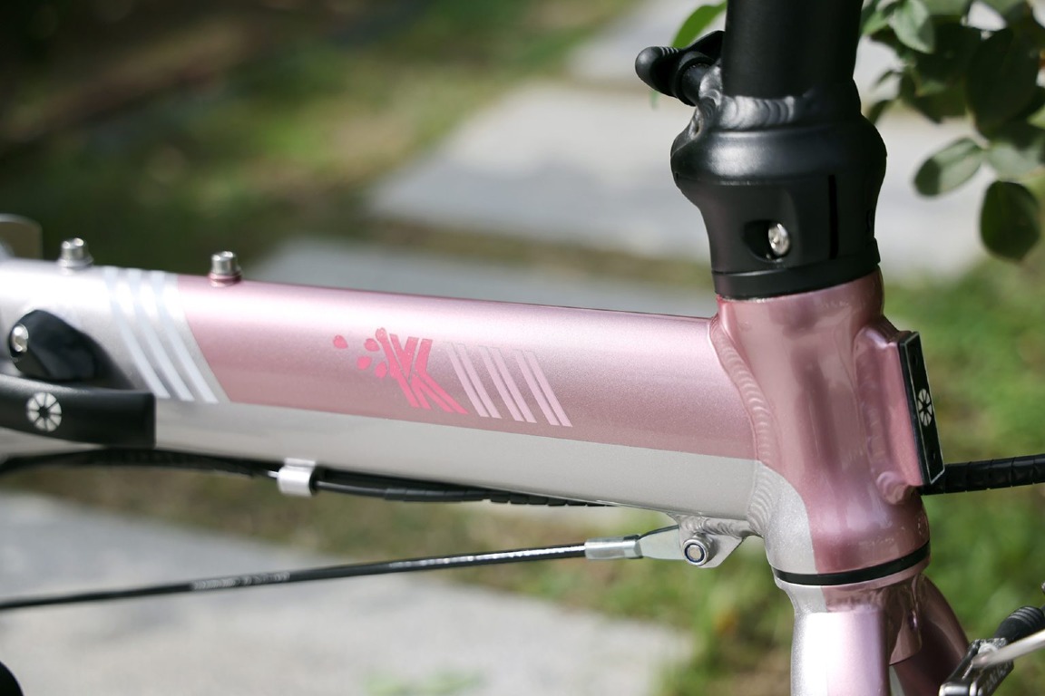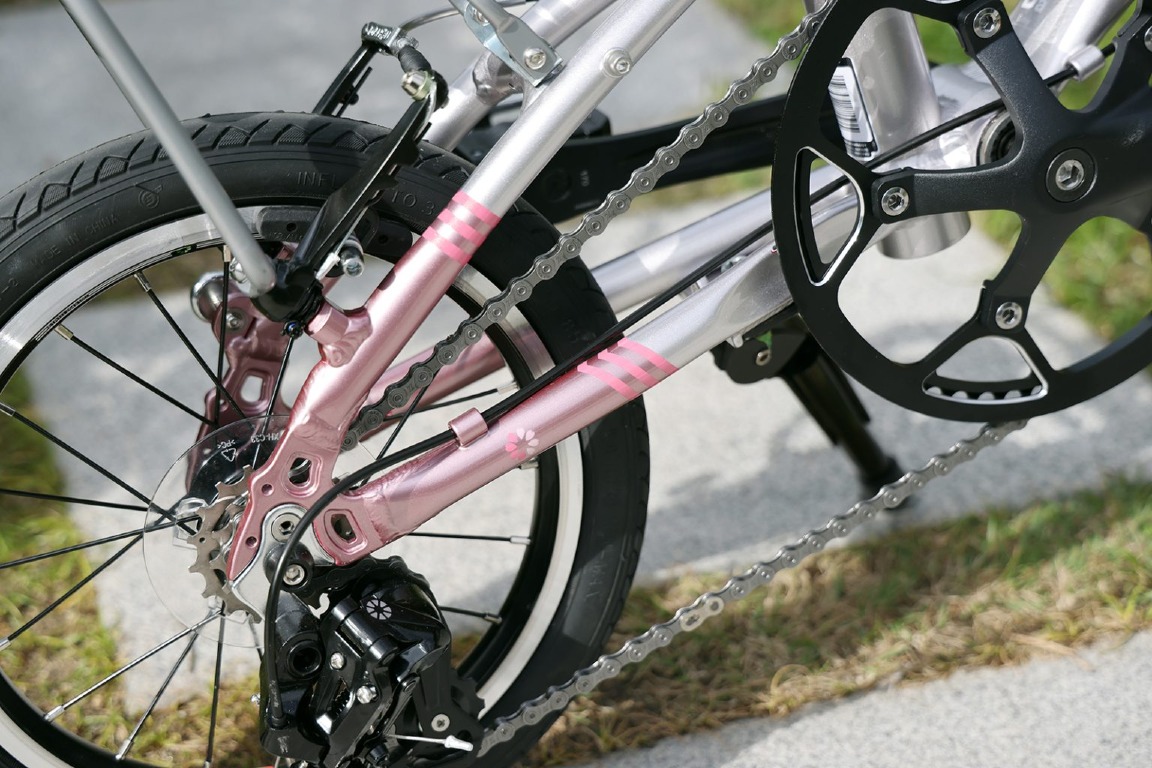 メインフレーム前方ではDAHONロゴの「O」を花弁に見立てたグラフィックを、モデル名ロゴの周囲にも花弁をレイアウトし、チェーンステーにもフローラルモチーフをプラスしました。
